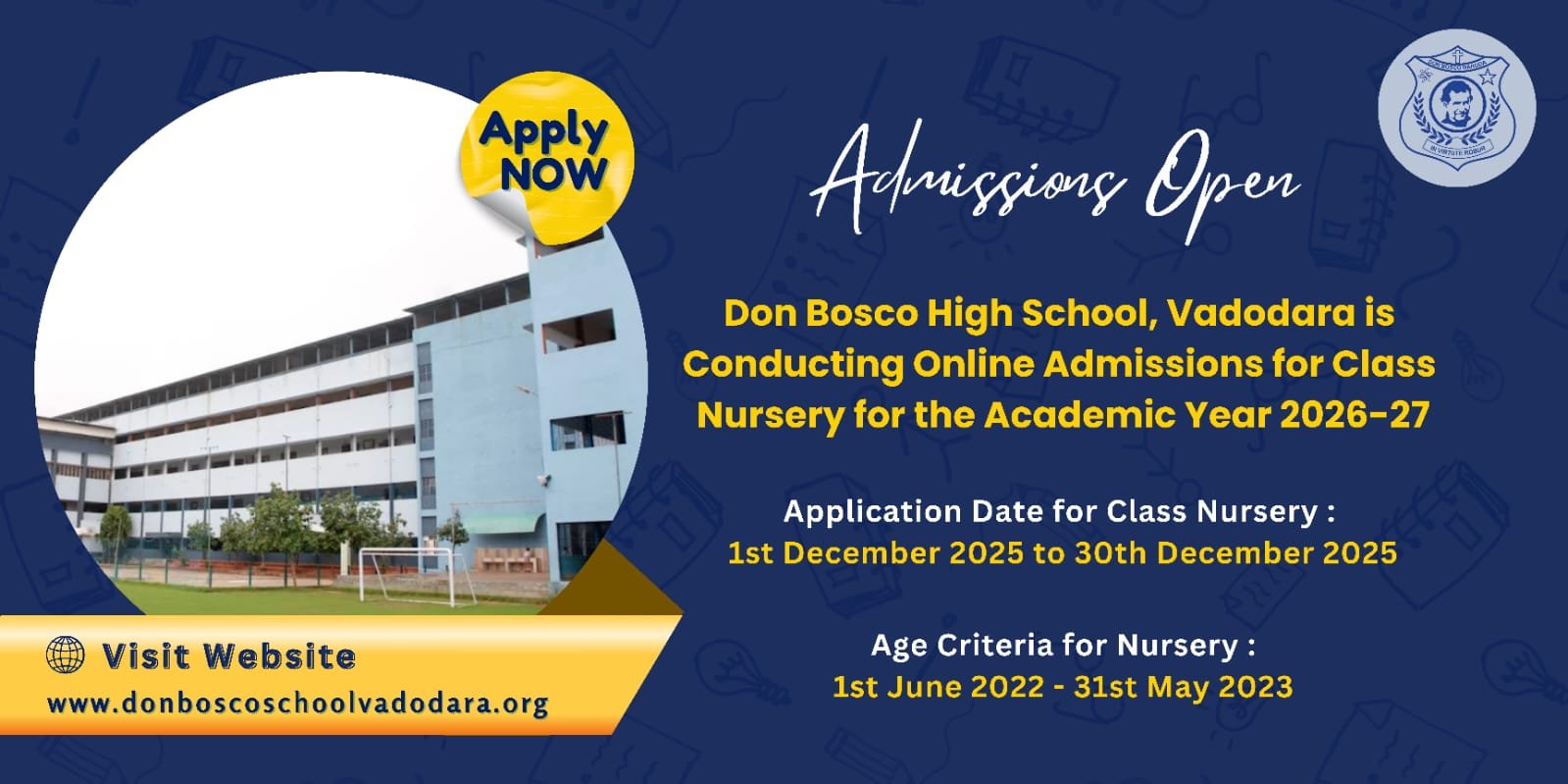 The online application portal for DON BOSCO SCHOOL admission will open from: 1st December 2025 at 11 AM and will remain open until the 31st of December 2025 at 06 PM.